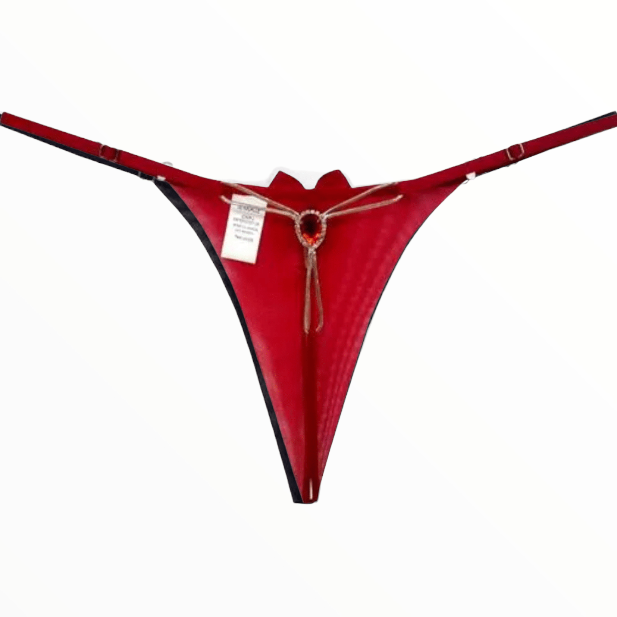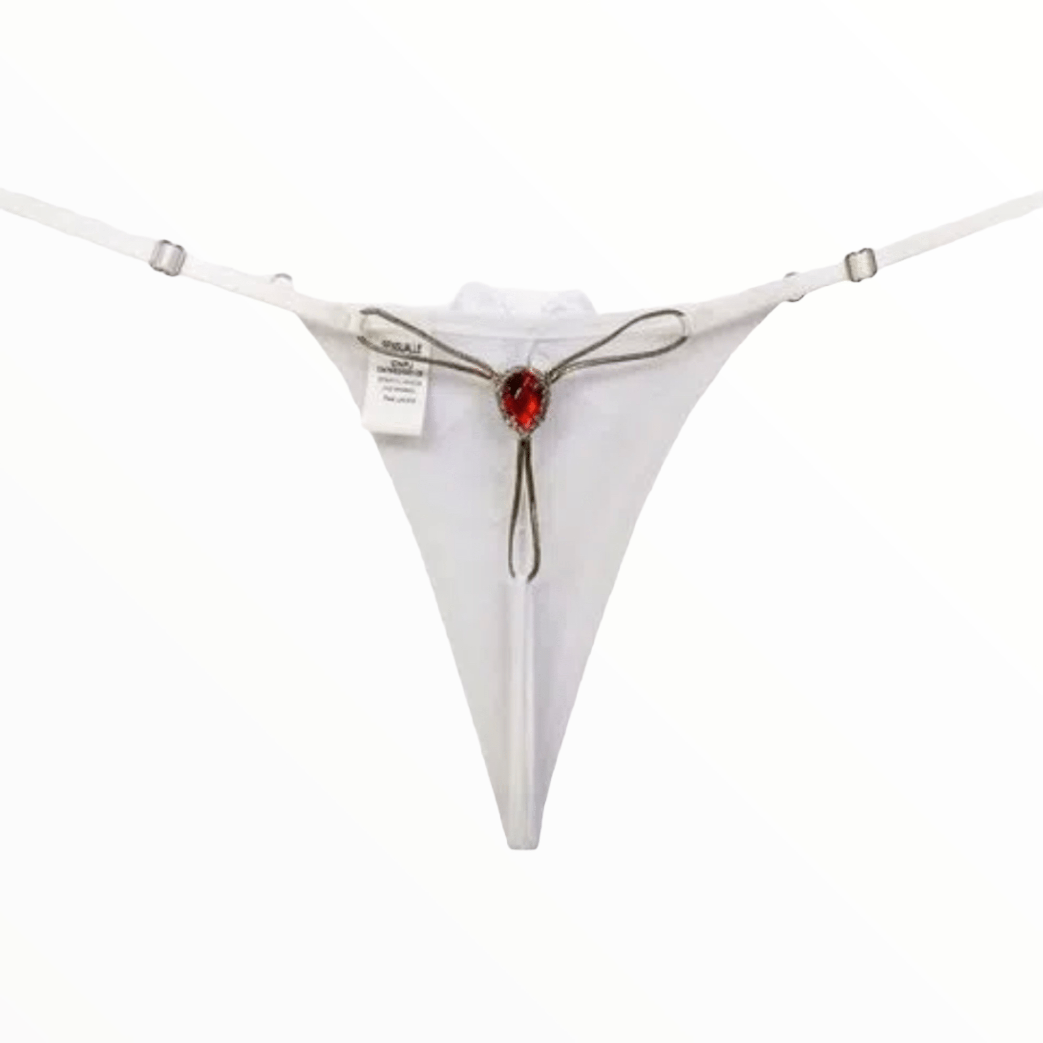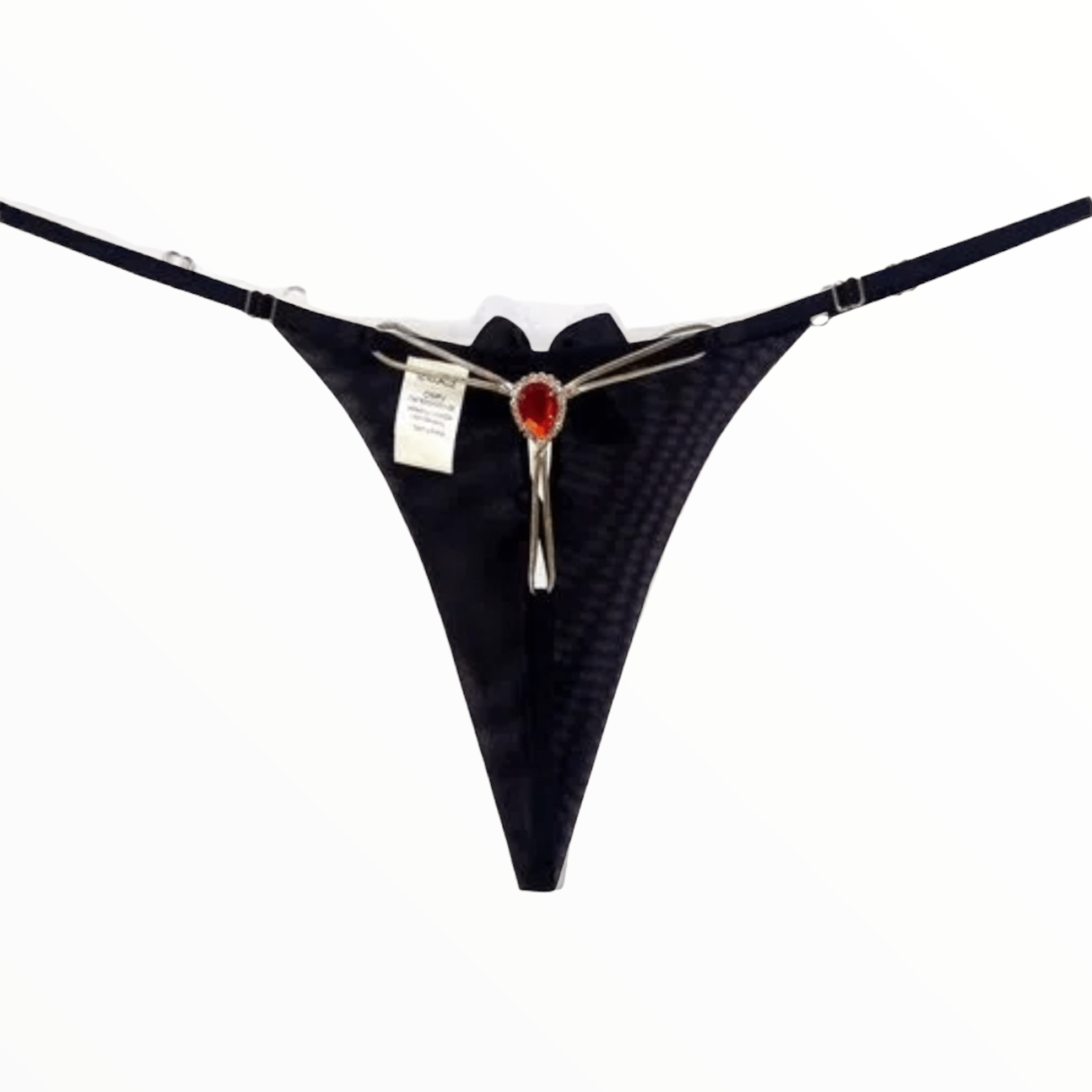 Detalhe: Biju de pedra sortida e strass no bumbum.