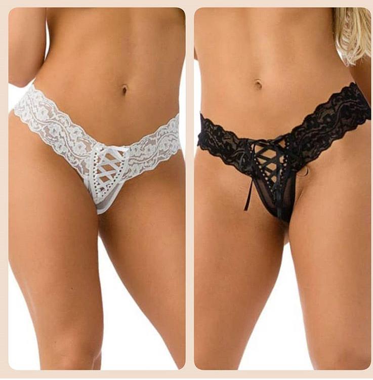 Ref.: Calcinha Disponível – Calcinha fio dental com abertura. Em tule e renda com detalhe trançado na frente. Perfeita para as ocasiões mais quentes.