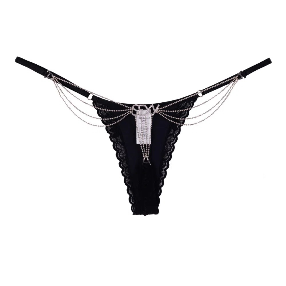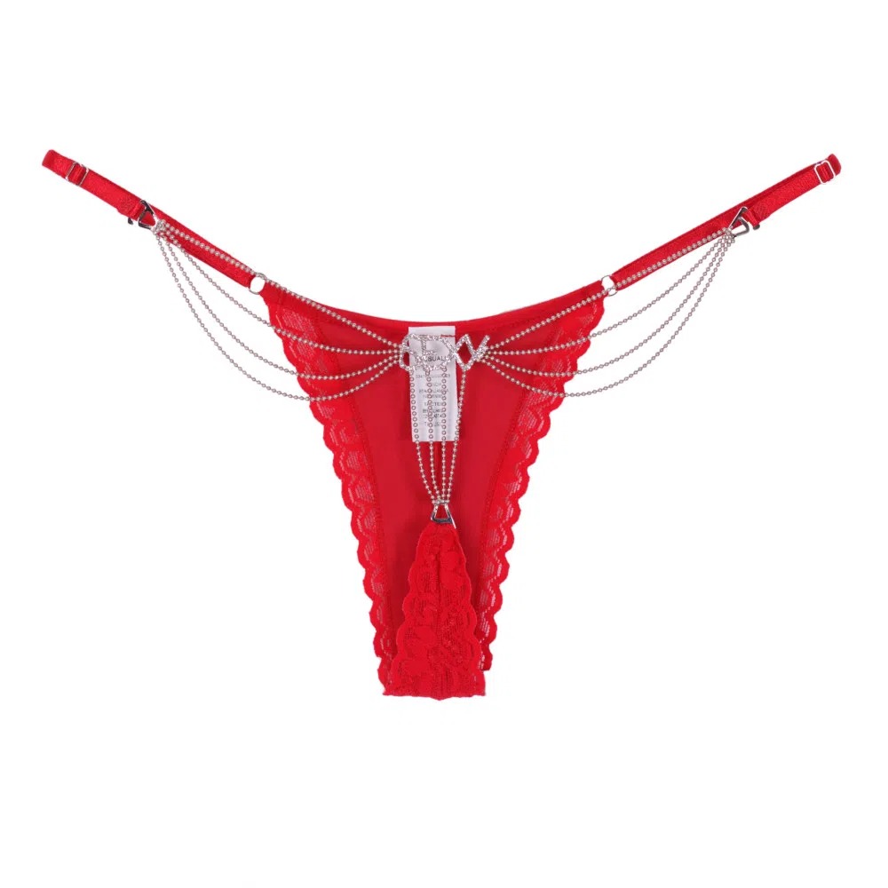Calcinha Extraordinária – Calcinha fio dental em renda com biju luxuosa no bumbum. Cintura com regulagem, Glamour extravagante! Atenção! O desenho da renda pode sofrer alteração, não necessariamente sendo igual ao da foto.